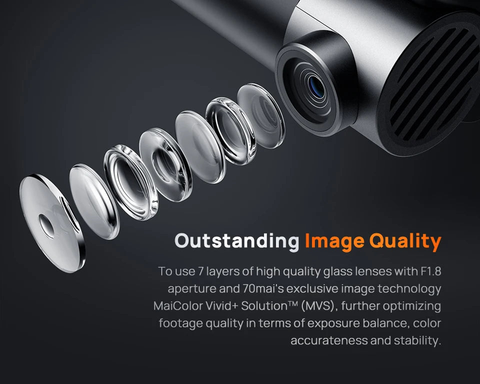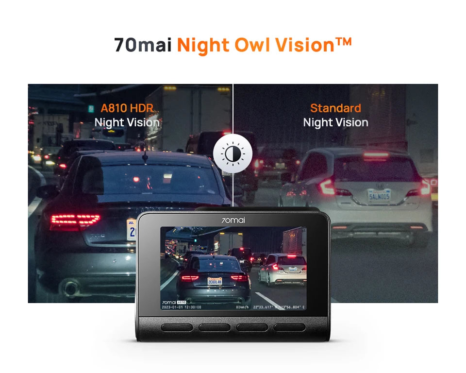 70mai A810 er laget for høy detaljgrad i krevende lys. Starvis 2-sensoren og WDR sikrer god skygge-/høylys-balanse, mens F1.8-optikken slipper inn rikelig med lys for tydeligere nattopptak. Innebygd GPS legger hastighet og posisjon i videologgen, og ADAS kan varsle om potensielle farer i trafikken. Med Wi-Fi og appen håndterer du klipp, innstillinger og firmware-oppdateringer rett på mobilen.