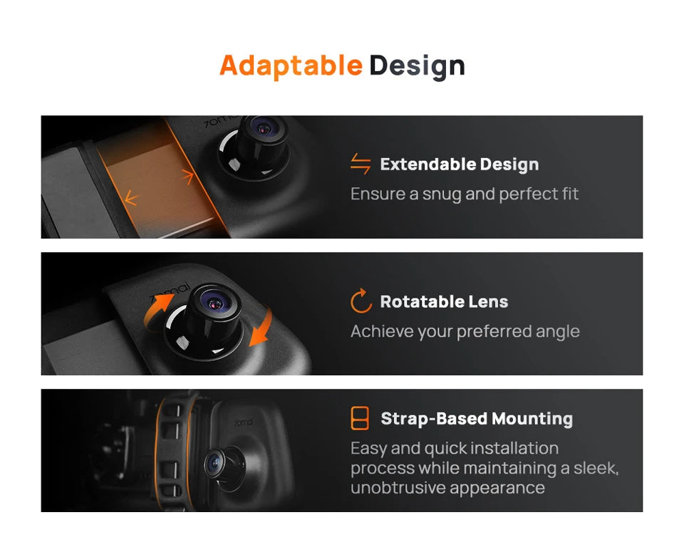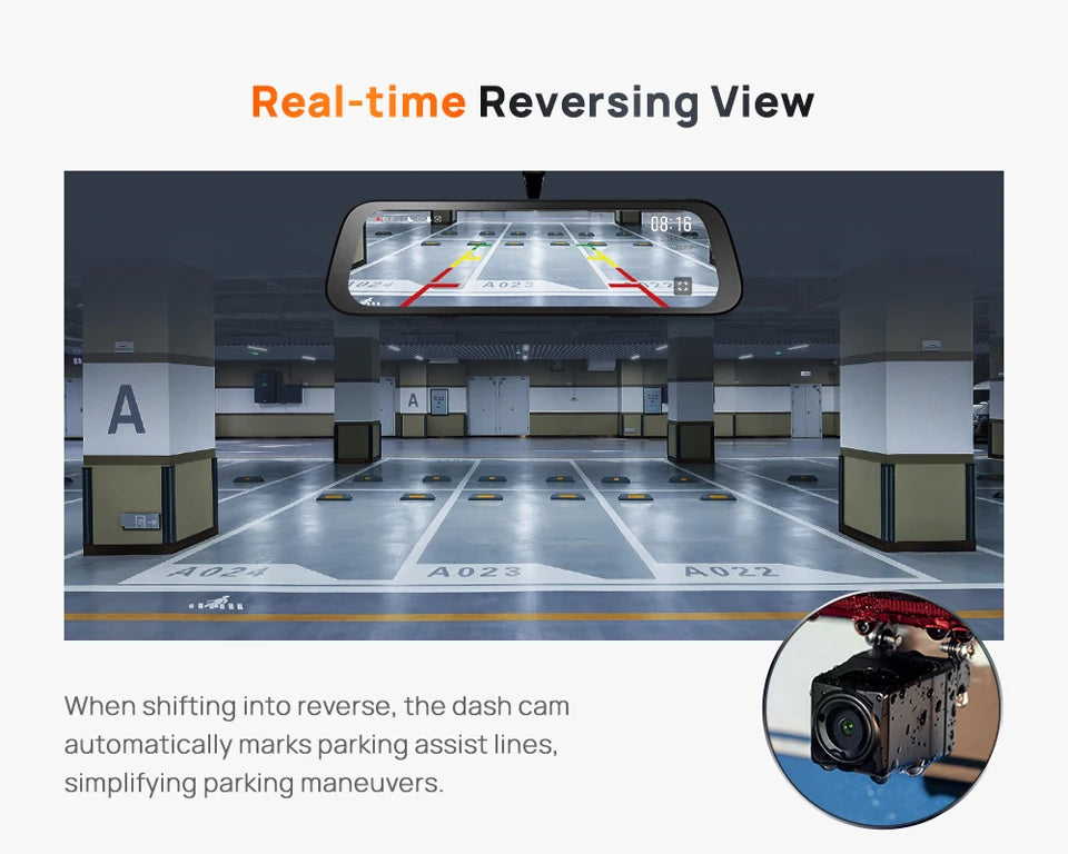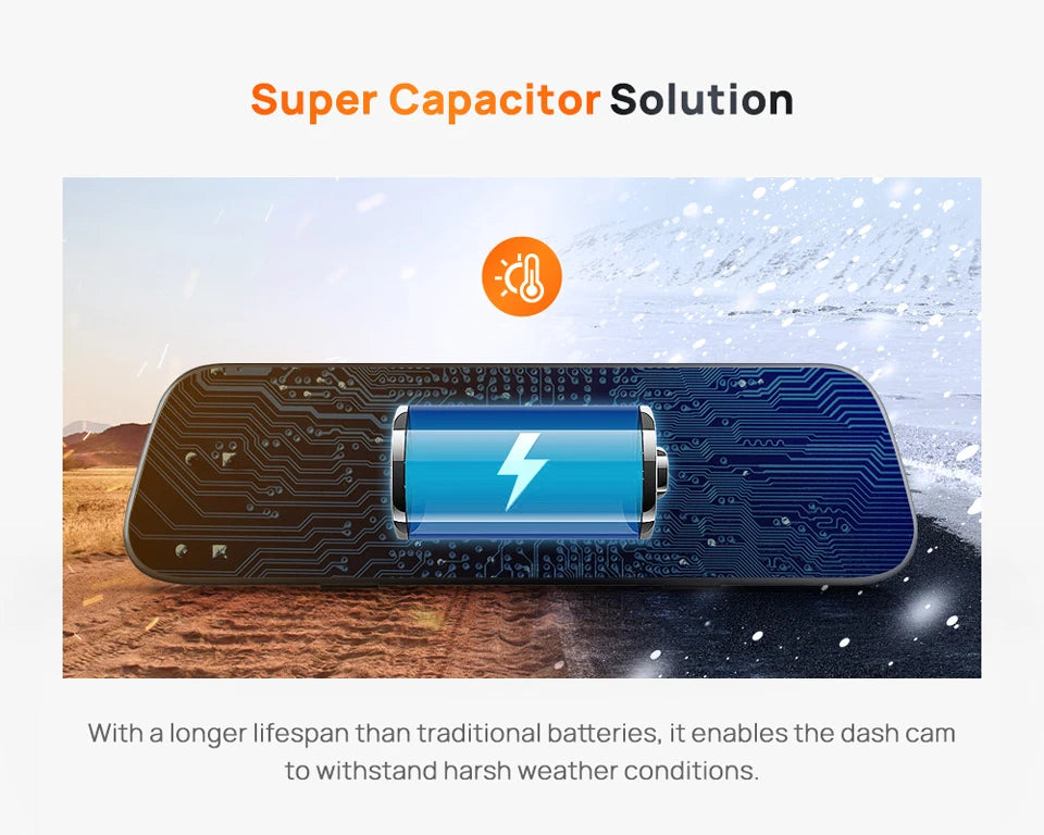 70mai S500 speil-dashcam gir 2.5K (1944p) frontopptak, medfølgende bakkamera, 9,35” berøringsskjerm, HDR/WDR og Sony IMX675 for skarpe opptak i både dagslys og mørke, Wi-Fi-app, stemmestyring samt superkondensator for driftssikker lagring. Parkeringsmodus støttes ved bruk av hardwire-kit (micro-USB).