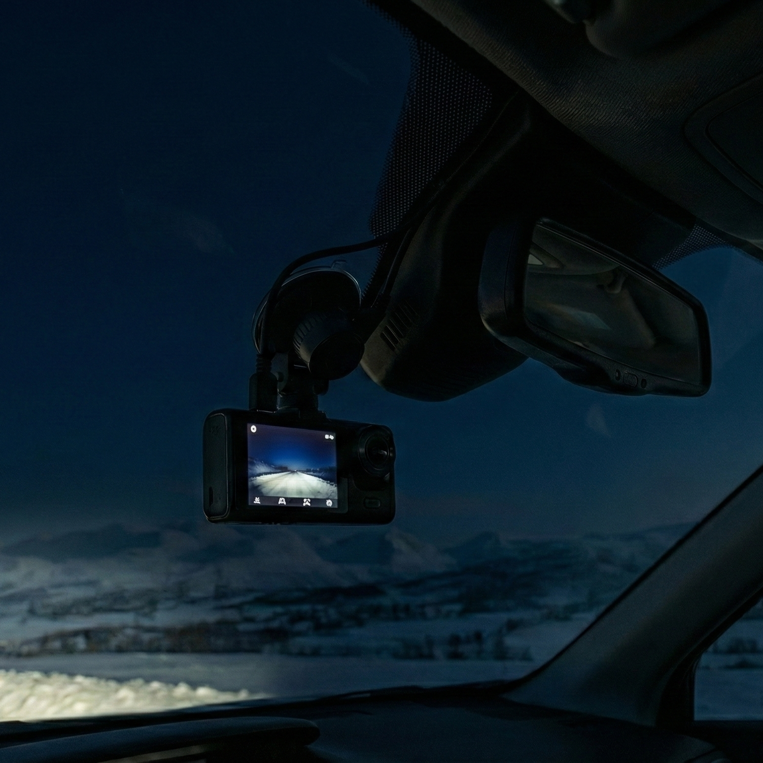 På skjermen kan du se opptakene. Om nødvendig, juster kameraets vinkling for å sikre at du får et klart bilde av veien foran og eventuelt innsiden av bilen.