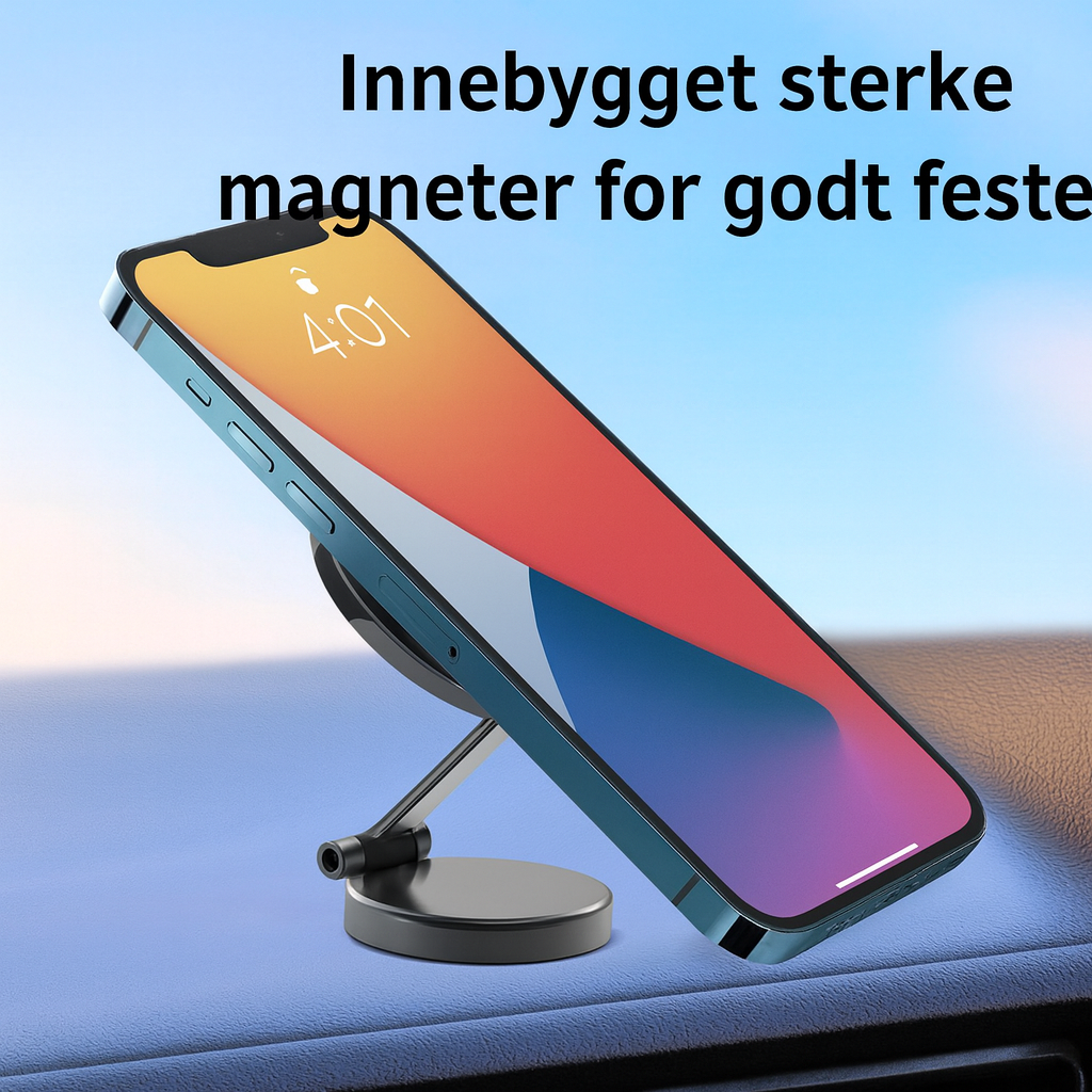 Med det magnetiske bilfestet med 360° rotasjon får du et stabilt og fleksibelt feste for mobiltelefoner fra 4–7,2 tommer, med kraftige magneter som ikke påvirker signaler, samt sugekoppfeste og sammenleggbart design for enkel plassering i bilen.